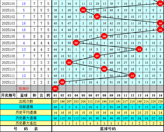 一号球分析:上期开出奖号03,该位最近10期出现范围在01-13之间,中位号码为07,其中小于中位号码的奖号开出8次,大于中位号码的奖号出现2次,中位号码07没有出现,本期该位继续关注中位号码以下的红球,考虑号码01。