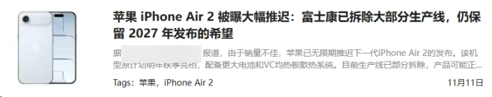 iPhone Air同样遭遇市场冷遇。其极致的轻薄设计虽然令人印象深刻,但在续航、散热等方面的妥协,使得这款产品难以成为主流选择。